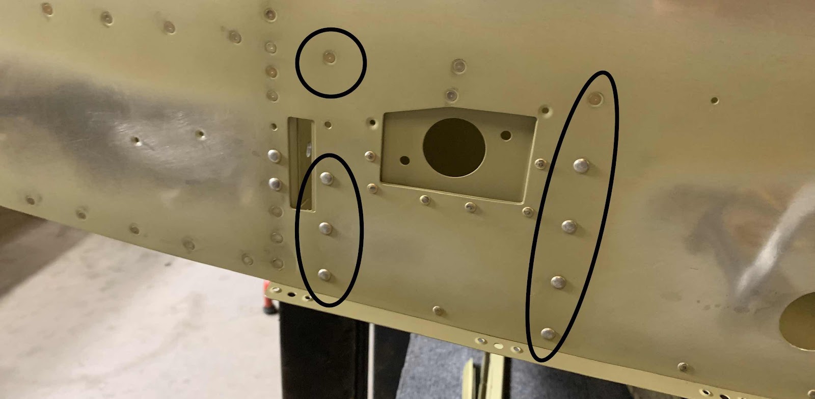 When I originally started installing the Right Side Skin (starting in the center and working aft per the plans), I skipped the four rivet locations (circled below) because I thought I needed help to install them. Reaching to arms length on either side of the Side Skin with the bucking bar in my left hand and the rivet gun in my right (with a 5” set to clear the Bulkhead Assembly).....I thought would produce rivets with “smilies” on them or screw up the shop head on the opposite side. Well, after some head scratching and practice, I was able to install them myself.....with NO SMILIES AND GREAT SHOP HEADS!!! So, I did....circled in white above.