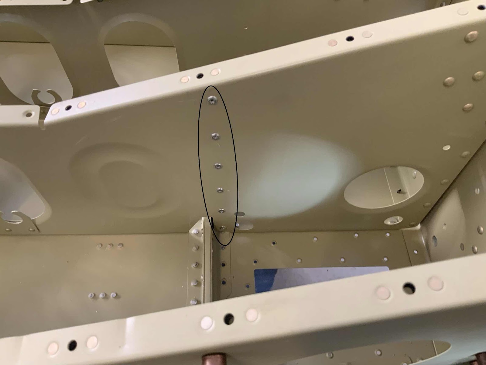 After clecoing the F-01404 Bulkhead to the F-01484 Center Bottom Skin, it’s now time to start riveting them together. To start, the F-01416B Seat Rib Angles get riveted to the Seat Ribs with six LP4-3 blind rivets. The picture below shows the location of the rivets circled in black. This is the “outside” of the right Seat Rib.....