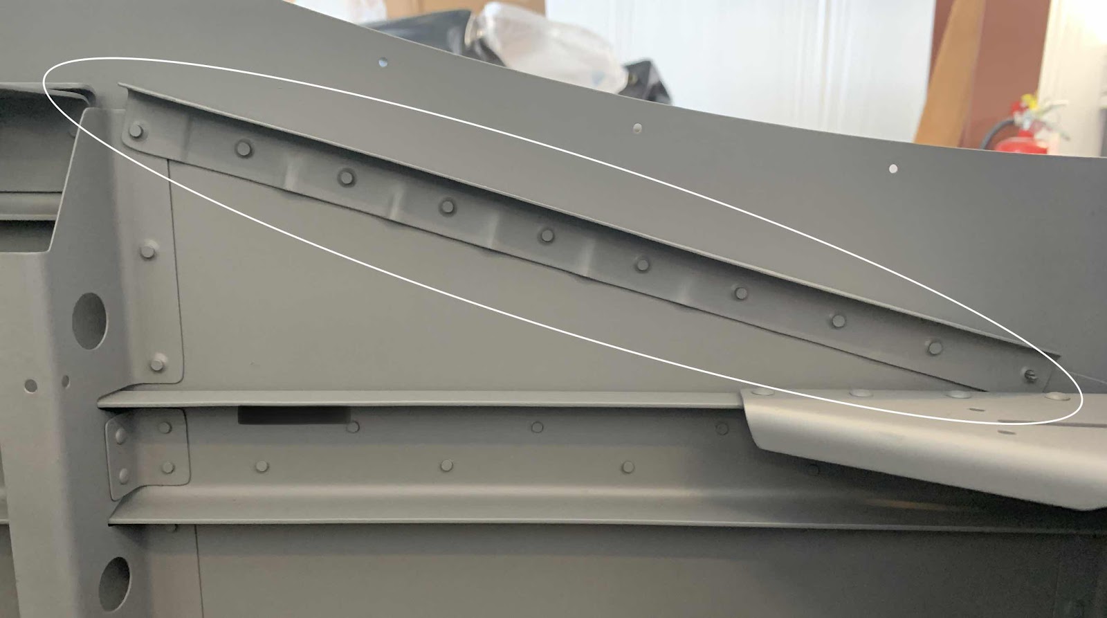 The last step in closing out this section is installing the F-14125-R & -L Skin Stiffeners. In the two pictures below, both Stiffeners have been prepared and riveted into place on the Aft Fuselage Top Side Skin using the AN426 rivets called out in the plans. Here is the left (pilot) side…..
