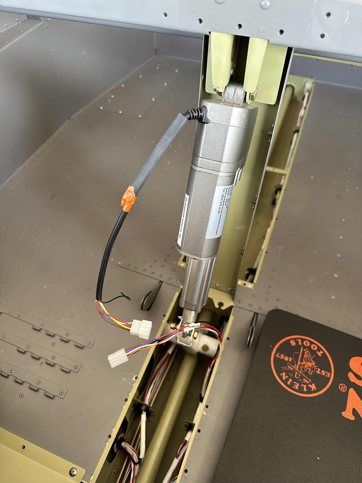 The next two pictures show the completed install of the actuator. I also secured the wire bundle to the flap motor channel with an adel clamp. I will need to make a “notch” on the flap motor front cover to clear the bolt head, as the “notch” from manufacturing is on the other side. (I installed the missing cotter pin and tightened the bottom nut, right after I took this picture).